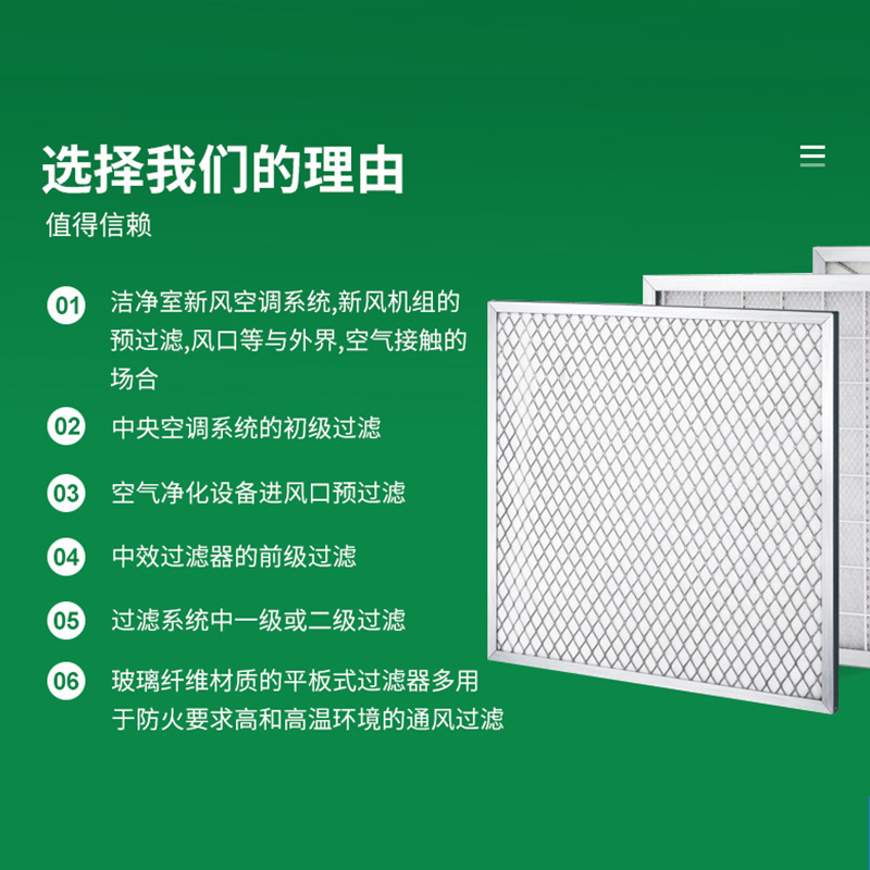 1. 材料:一般采用玻璃纤维、无纺布、尼龙网等易于清洁或更换的材料。